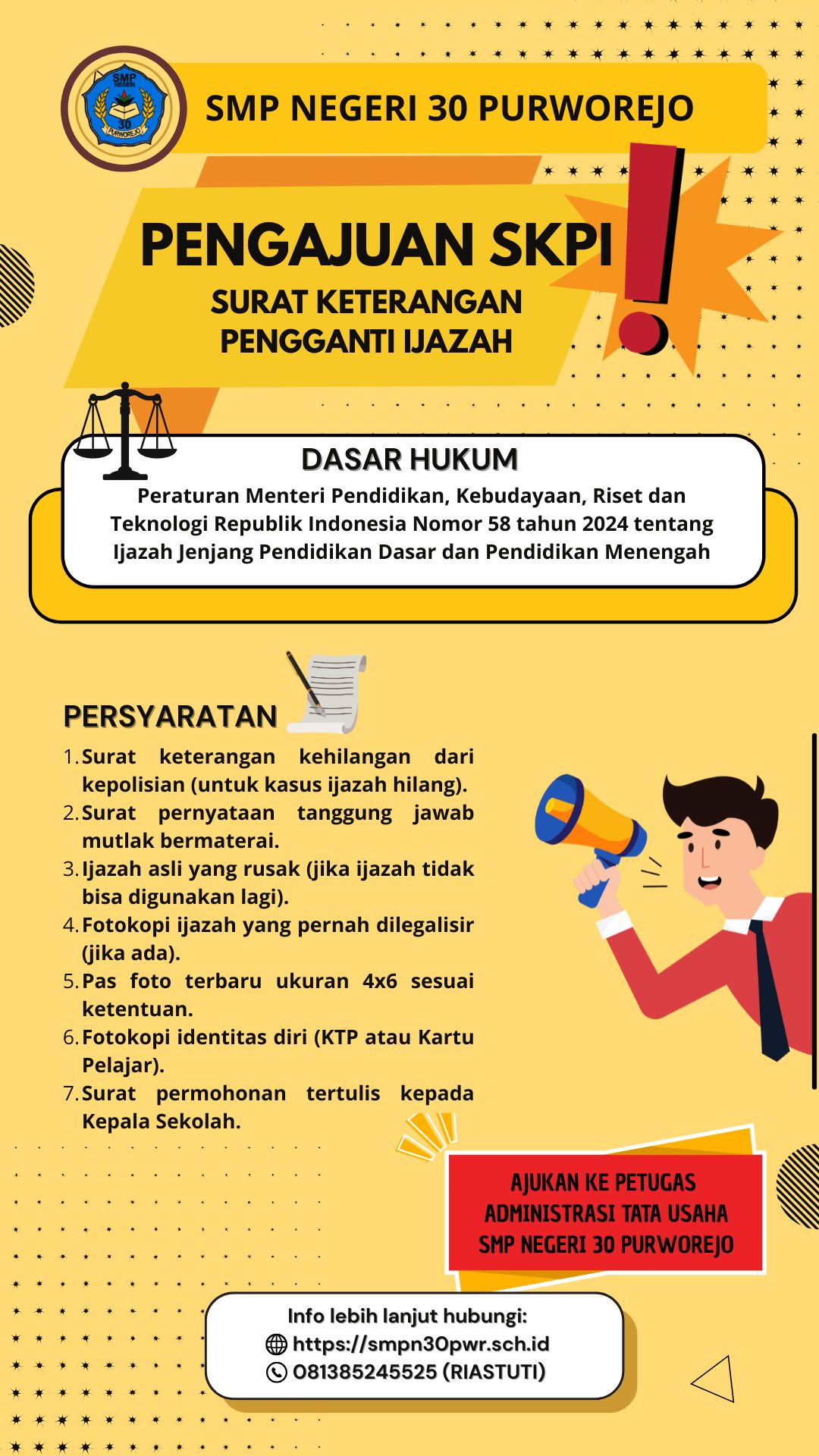 Ijazah merupakan dokumen resmi yang sangat penting sebagai bukti kelulusan peserta didik. Namun, dalam kenyataannya tidak sedikit alumni yang mengalami kehilangan atau kerusakan ijazah sehingga membutuhkan dokumen pengganti. Untuk mengantisipasi hal tersebut, SMP Negeri 30 Purworejo memberikan layanan penerbitan surat Keterangan Pengganti Ijazah (SKPI) yang dapat diajukan oleh siswa maupun alumni.
